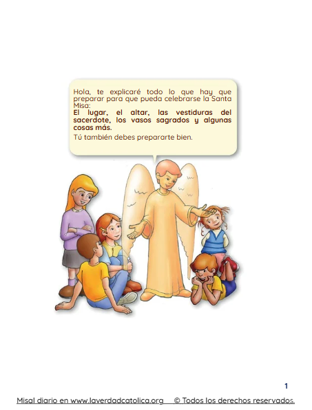 — Guía ilustrada y amena para los niños con la explicación de la Santa Misa, y cada una de sus partes, así como el lugar de la celebración, las vestiduras del sacerdote, los elementos que se utilizan, plegarias eucarísticas, oraciones para después de comulgar.